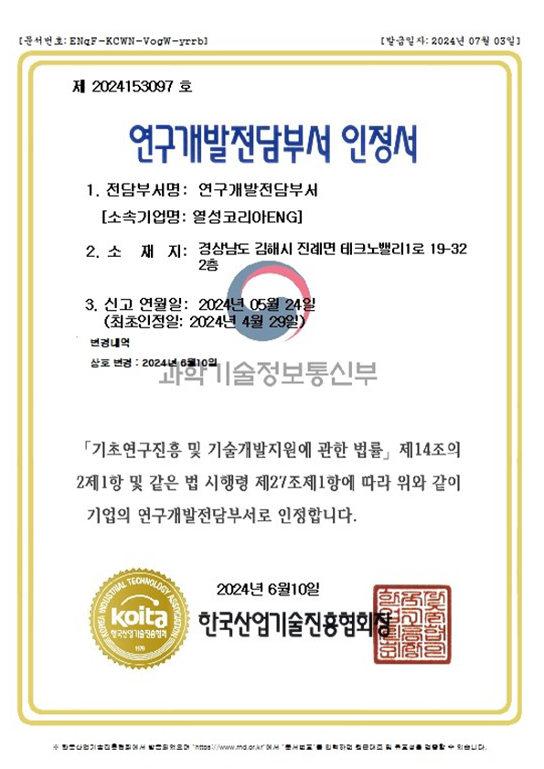 연구개발전담부서 인정서